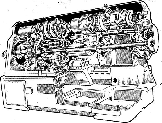 Универсальное неавтоматизированное оборудование было преобладающим во всех отраслях машиностроения до 20-х годов нашего столетия, когда увеличение масштабов производства, растущая потребность изготовления большого количества одних и тех изделий (часовая, автомобильная, подшипниковая промышленность обусловили широкое применение второй групп ы – универсальных автоматов и полуавтоматов. Их основное преимущество перед станками с ручным управлением – высокая производительность и значительные возможности многостаночного обслуживания. На рис. 1-5 показан конструктивный разрез универсального многошпиндельного токарного автомата последовательного действия с горизонтальной осью.