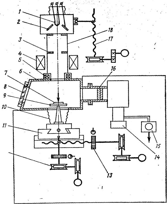 1 - катод: 2 - фокусирующий электрод; 3- диафрагма; 4- фокусирующая система; 5 – отклоняющая система; 6- рабочая камера;7- обрабатываемое изделие; 8- смотровое окно; 9 – приспособление для закрепления изделий;10 – герметизирующий сильфон; 11 – координатный столик; 12 – привод перемещения; 13 – датчик положения; 14 – вакуумный агрегат; 15 – форвакуумный насос; 16 – вакуумная ловушка; 17 – механизм подъёма; 18- корпус ЭОС.