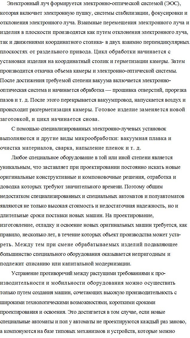 В последние годы значительное количество новых образцов специализированного оборудования вызвано появлением новых прогрессивных методов обработки, прежде всего электрофизических и электрохимических методов, широкое распространение которых обусловлено появлением новых типов изделий, которые не могли быть получены с помощью методов классической технологии. Это относится в первую очередь к электронной промышленности, где постоянно действующие тенденции микроминиатюризации изделия потребовали комплекса методов микрообработки.