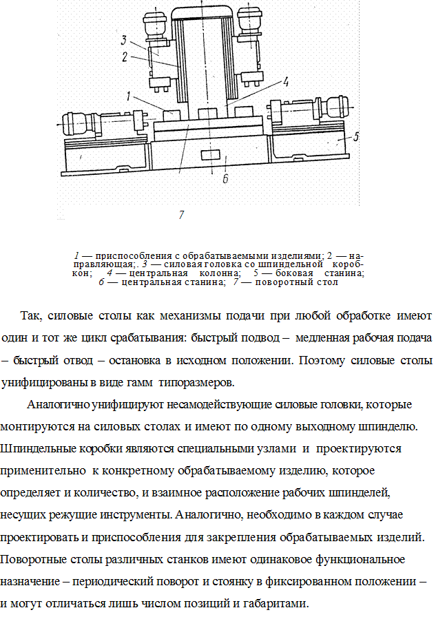 Агрегатные станки компонуются из разнотипных унифицированных механизмов и узлов с минимальным количеством оригинальных конструктивных элементов. Они предназначаются обычно для выполнения сверлильных, расточных операций; нарезания резьбы в отверстиях; фрезерования плоскостей, пазов и выступов. Многопозиционный агрегатный станок-полуавтомат имеет следующие основные функциональные узлы: силовые столы, несамодействующие силовые головки, шпиндельные коробки, поворотный стол с приводом поворота, боковые станины, вертикальные стойки, центральную станину.