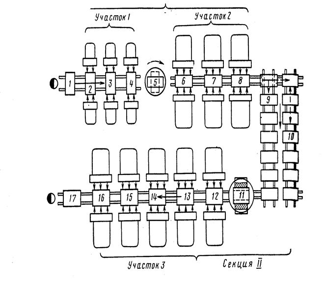 Типовая планировочная схема автоматической линии из агрегатных станков показана на рис. 1-10. Линия скомпонована однопозиционных двухсторонних агрегатных станков, работающих на проход, и разделена на две независимые секции, между находится межоперационный накопитель. В линии имеется 11рабочих позиций, на которых обрабатываемые одновременно с двух сторон, а иногда – и сверху изделия зажимаются и фиксируются в стационарных приспособлениях. Между отдельными технологическими участками 1, 2, 3 располагаются механизмы изменения, ориентации в вертикальной 5 и горизонтальной плоскостях 11. Установка изделий на первую позицию и съём с последней произво- дятся вручную или с помощью подъёмно-транспортных средств. Автоматические линии из агрегатных станков, как правило, относятся к линиям с жёсткой межагрегатной связью, где станки и элементы транспортной системы должны работать в едином жёстком ритме, а отказ любого элемента (инструмента, механизма, устройства) вызывает останов всей линии. В линиях, разделённых на отдельные секции межоперационными накопителями, жесткая связь осуществляется в пределах одной секции.