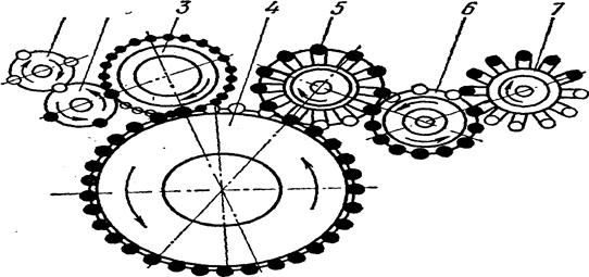 1 – ротор загрузки; 2,5, 7 – транспортные роторы; 3,4,6 – технологические роторы
