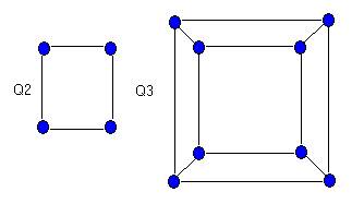 Важный класс графов, называемых кубами, наиболее естественно описывается с помощью произведений. Рекурсивно определяется п-мерный куб Qn: Q1=K2 и Qn=K2xQn-1. Таким образом, Qn имеет 2n вершин, которые можно представлять наборами а1...аn, где an равно 0 или 1. Две вершины (или точки) куба Qn смежны, если их двоичные представления отличаются только в одной позиции (в одном разряде). Q2 и Q3 показаны на рисунке.