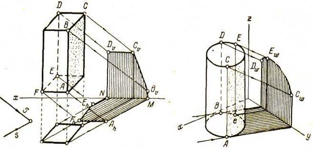 От контура собственной тени строится контур AhBvCvDvEhFhAh падающей тени с точками перегиба М и N на оси х. На рис. 3 построены тени цилиндра, стоящего своим основанием на горизонтальной плоскости. Горизонтальные проекции световых лучей, проведенные касательно к основанию цилиндра, определяют точки А и В — основания образующих цилиндра, которые являются линиями раздела света и тени боковой поверхности цилиндра. К контуру собственной тени относится также дуга CED верхнего основания цилиндра. От указанного контура строится контур падающей тени, для чего достаточно определить падающие тени Cw и Dw от точек С и D, а также тени от ряда промежуточных точек дуги CED верхнего основания цилиндра (см. тень E,w).