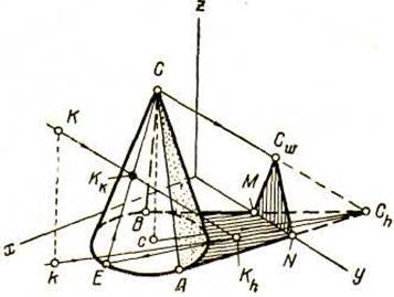 Прямая ECh является тенью образующей конуса, на которой должна находиться падающая тень Kh от точки К. Проводим из точки Е образующую ЕС. В пересечении ее с первичной проекцией светового луча, проведенной через первичную проекцию точки К, находим искомую тень от точки К на поверхности конуса.