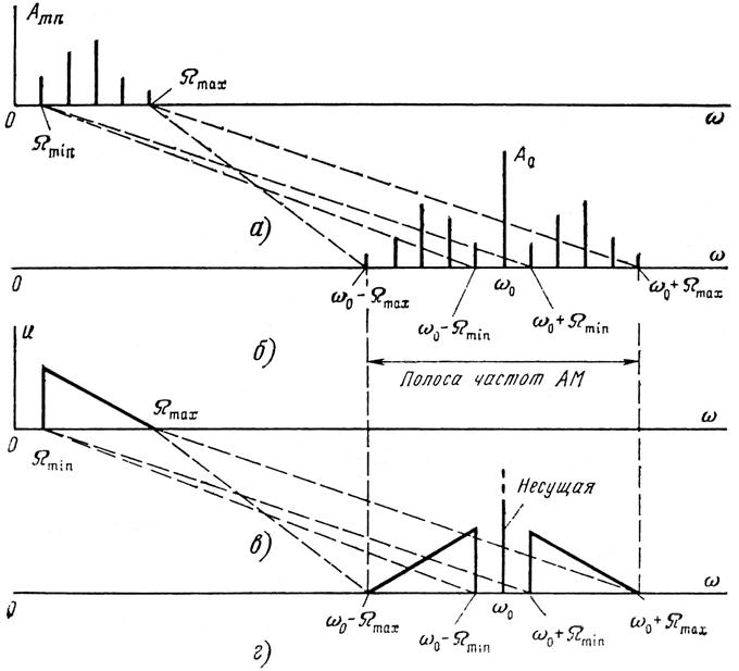 Спектральные диаграммы: а) – модулирующего многотонального сигнала; б) – АМ сигнала при многотональной модуляции; в) – модулирующего сигнала с непрерывным спектром; г) – АМ сигнала при модуляции сигнала непрерывным спектром.
