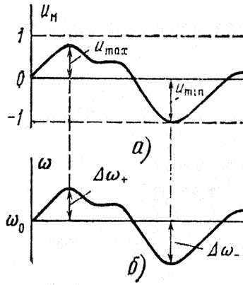 При гармоническом модулирующем сигнале временные диаграммы ЧМ и ФМ имеют совершенно одинаковый вид. Отличить их можно, только сравнив изменение мгновенной фазы модулированного сигнала с законом изменения модулирующего колебания.