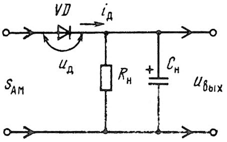 Это диодный детектор, который получил самое широкое распространение для детектирования АМ сигналов как в профессиональной, так и в бытовой радиоаппаратуре. В диодном детекторе используются в основном полупроводниковые (германиевые, кремниевые и др.) диоды.