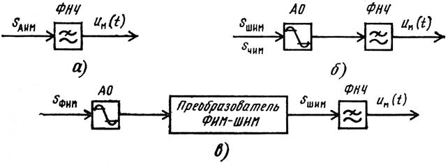 В спектре сигналов ФИМ уровень составляющих частоты модуляции незначителен и, кроме того, он зависит от частоты модуляции, поэтому детектирование сигналов ФИМ фильтром нижних частот осуществляться не может. Сигналы ФИМ сначала преобразовываются в АИМ или ШИМ сигналы, которые затем детектируются ФНЧ.