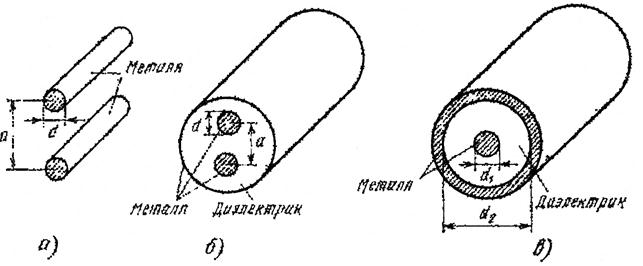 а) – двухпроводная воздушная линия; б) – кабельная симметричная экранированная линия; в) – коаксиальная кабельная линия.