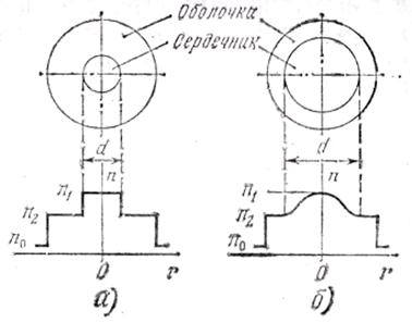Простейший световод представляет собой тонкое волокно цилиндрической формы, которое состоит из сердечника, оболочки и внешнего покрытия. По сердечнику передается электромагнитная энергия в виде световой волны, поэтому его изготавливают из материала с наименьшими оптическими потерями (кварц, многокомпонентные стекла). Оболочка предназначена для создания лучших условий отражения на границе сердечник — оболочка и уменьшения излучения энергии в окружающее пространство. В оболочке можно допустить большие потери, поэтому ее изготавливают из стекла или из пластика. Для защиты от внешних воздействий (световых, механических) на оболочку световода наносится полимерное покрытие. Поперечное сечение волокна и распределение показателя преломления показаны на рисунке.