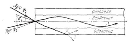 Пусть в центр торца ступенчатого световода падает луч под некоторым углом к его оси. По законам геометрической оптики на границе сердечник — оболочка будут падающий луч с углом отраженный с углом и преломленный с углом. Преломленный луч в свою очередь претерпевает такое же отражение в точке В на границе оболочка — покрытие. Следовательно, в световоде могут существовать три вида лучей (волн): сердечника 1, оболочки 2, излучения 3. Для эффективного распространения и предотвращения перехода энергии в оболочку.