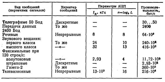 Производительность источника сообщений является одной иэ основных его характеристик, так как каналы передачи сообщений должны строиться так, чтобы обеспечить передачу выдаваемого источником количества информации. Для типовых первичных сигналов, считая, что преобразователь сообщения — первичный сигнал — не вносит искажений, расчеты производительности сведены в таблицу. При подсчете производительности источников непрерывных сообщений (первичных сигналов) считалось, что распределение уровней квантования равновероятно и АЦП обеспечивает высокое качество (малый шум квантования).
