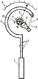 Для создания противодействующего момента предусмотрена 10, один конец которой закреплен на зубчатом колесе, а другой – на станине прибора. Влияние температуры окружающей среды на показания прибора компенсируется биметаллическим или инварным компенсатором 4.
