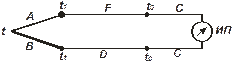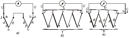 При включении по схеме б ТЭП имеет четыре спая: рабочий 1, свободный 2 и два нейтральных 3 и 4 при постоянной температуре t1. Несмотря на внешнее различие схем, термоЭДС в обоих случаях будут одинаковы, если концы проводника С будут равны.