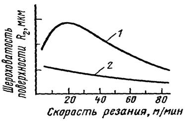Из графика видно, что в зоне малых скоростей (до 5 м/мин), когда нарост не образуется, размеры неровностей не значительны. При увеличении скорости до 10-20 м/мин размеры неровностей поверхности возрастают, достигая при 15 м/мин наибольшего значения. Дальнейшее повышение скорости резания уменьшает величину нароста и понижает высоту неровностей обработанной поверхности.