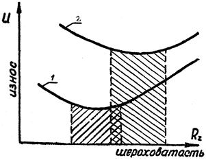 Всё вышеуказанное хорошо иллюстрируется графиками зависимости величины износа от высоты микронеровностей поверхности, которые показывают, что каждому условию работы соответствует своя оптимальная зона (на рисунке 3.6, заштрихована) высоты неровностей.