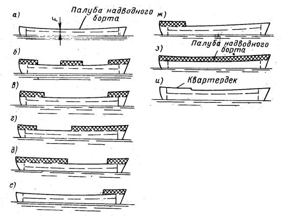 По количеству и расположению надстроек различают следующие архитектурные типы судов (рис.1.14):