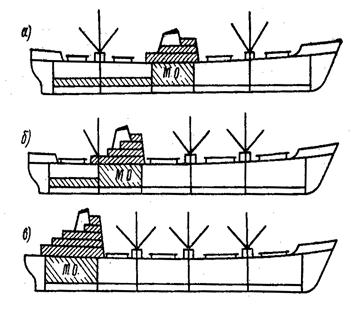 Архитектурно-конструктивный тип судна определяется также расположением машинного отделения (МО). Современные суда обычно имеют кормовое, смещенное в корму (промежуточное) или среднее расположение МО (рис.1.15). В последние годы чаще встречаются суда с кормовым или промежуточным расположением МО, так как такое расположение МО позволяет выделить для груза наиболее удобные для грузовых операций судовые помещения.