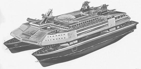 Катамараны более устойчивы на волнении и имеют значительно большую площадь верхней палубы, что позволяет разместить больше пассажирских помещений или груза. У трисеков два сигарообразных корпуса с машинными установками расположены ниже поверхности воды, что практически, исключает волновую составляющую сопротивления воды и значительно уменьшает затраты мощности на движение судна, уменьшает вибрацию и шум в третьем корпусе. Третий корпус расположен над водой и соединяется с подводными корпусами с помощью колонн; в этом корпусе размещаются пассажирские, жилые, служебные помещения, груз. Этот архитектурный тип судна характерен для высокоскоростных судов.