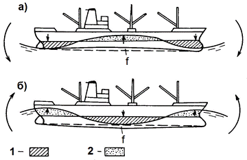 1 – вышедший из воды объем; 2 – вошедший в воду объем; f – стрелка прогиба корпуса от действующих на него сил.