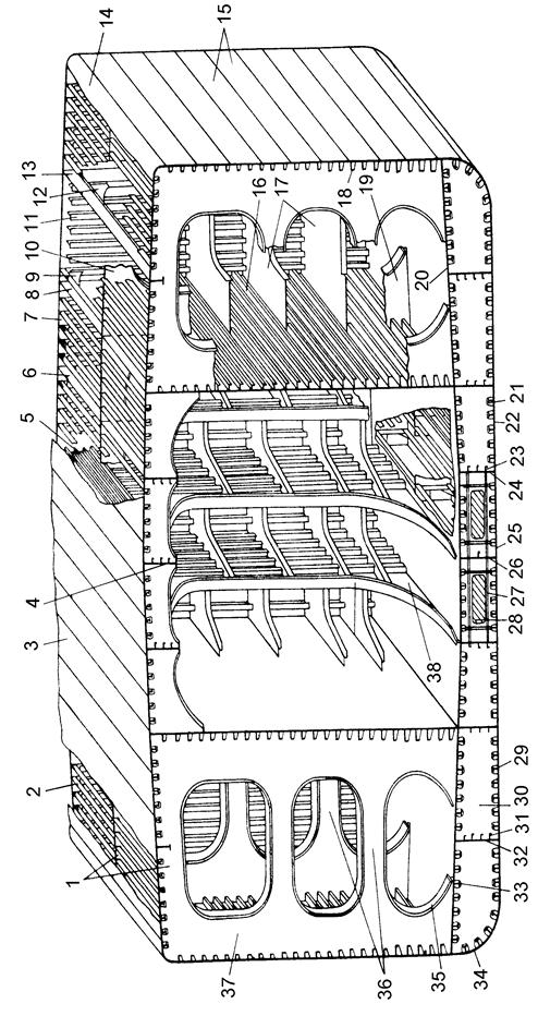Если часть перекрытий корпуса (обычно палуба и днище в средней части) спроектированы по продольной системе, а часть (обычно борта и вторая палуба) - по поперечной системе набора, то это судно имеет смешанную систему набора (рис. 5.8, 5.9).