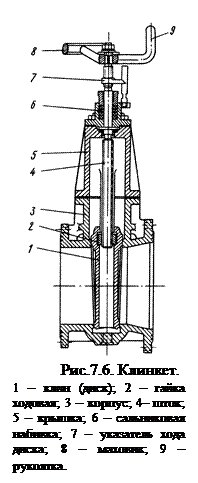 На трубопроводах больших диаметров устанавливают клинкеты (рис.7.6) и другую патентованную арматуру (типа “бабочка”, шаровые и т.д.). У клинкета проход перекрывается двумя дисками, расположенными под небольшим углом. Это позволяет обеспечить весьма значительные усилия прижима дисков к сёдлам при сравнительно небольших усилиях в штоке. В открытом положении диски убираются из прохода в верхнюю часть корпуса, обеспечивая минимальное сопротивление проходу жидкости.