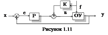 Данный способ (см. рисунок 1.11) достигает высокого качества управления, поскольку здесь идет коррекция управляющего воздействия не только по величине ошибки, но и по возмущающему воздействию, однако применение данного способа регулирования ограничено тем, что возмущающее воздействие f не всегда возможно измерить.