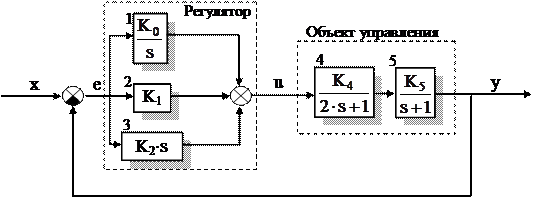 В структурной схеме АСР звенья, соответствующие регулирующему устройству, стоят перед звеньями объекта управления и генерируют управляющее воздействие на объект u. По схеме видно, что к схеме регулятора относятся звенья 1, 2 и 3, а к схеме объекта – звенья 4 и 5.
