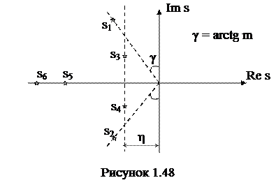 где Re(si) - действительная часть корня si. Пример определения степени устойчивости показан на рисунке 1.48. Линии построения показаны пунктиром. Степень устойчивости на рисунке определяется по самым правым корням (корни s3 и s4).