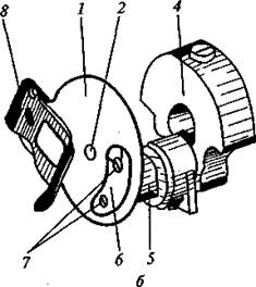 В машине 97-А применяется фасонный вращающийся тип механизма нитепритягивателя (рис.10). Нитепритягиватель 7 по отверстию 2 надевается на ось 3 пальца 5 кривошипа 4 и через сектор 6 винтами 7 прикрепляется к приливу пальца 5. К фронтальной доске рукава машины винтом и гайкой закрепляется нож для обрезки нитки в случае ее обрыва и устранения ее наматывания на профиль 8 нитепритягивателя 7.