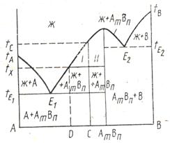 Құрамының вертикал сызығы диаграмманы екіге бөледі, оның әрқайсысын жеке екі жүйе ретінде қарастыруға болады. С құрамды қоспа tE1 температурасында балқи бастайды да tс температурасында сұйық күйге келеді. tх температурада бұл қоспа АmBn қосылысының кристалдарынан тұрады және D қоспасының балқымасынан тұрады. Фазалардың % құрамы рычаг ережесімен анықталады: конноданың ұзындығымен және оның I, II бөліктерінің ұзындығын өлшеп есептейді.