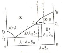 Если кристаллы В выпадали в избытке по сравнению с их массовой долей, необходимой для реакции (смесь а), то при температуре tП произойдет полное затвердевание расплава в виде смеси кристаллов В и AmBn. При избытке расплава (смесь b) последний сохраняется вплоть до эвтектической температуры tЕ. Выпавшие кристаллы В полностью расходуются в процессе реакции, и при дальнейшем охлаждении смеси ниже tП происходит кристаллизация соединения AmBn непосредственно из расплава. При температуре tЕ кристаллизуется также компонент А и смесь затвердевает полностью.