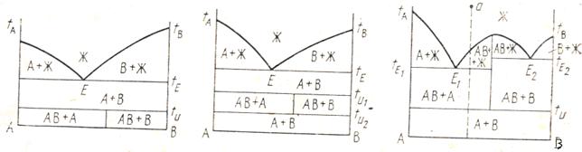 На диаграмме (рис 11, в) отражено образование химического соединения АВ, плавящегося без разложения, но существующего лишь в области высоких температур. При температуре tи соединение АВ распадается на составные части. Таким образом, если имеется расплав затвердевает при температуре tЕ1 в виде механической смеси – эвтектики из кристаллов А и АВ. По достижении температуры tи образовавшееся соединения распадается, в результате чего останется только смесь кристаллов А и В. Такой же процесс наблюдается и в правой части диаграммы с той лишь разницей, что в избытке будет компонент В, а компонент А полностью войдет в соединение АВ.