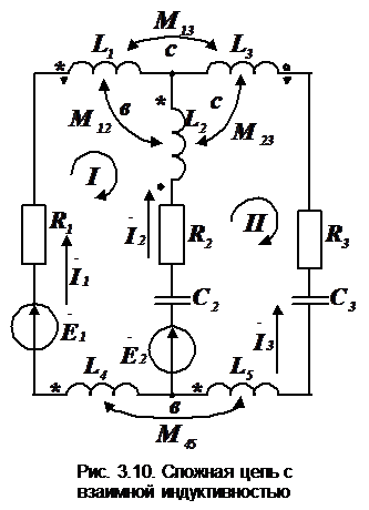 Пусть задана двухконтурная цепь, содержащая индуктивно связанные элементы (рис. 3.10). Для ее расчета необходимо составить три (по числу неизвестных токов) уравнения по законам Кирхгофа. Первое уравнение, для верхнего узла, затруднений не вызывает: