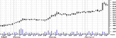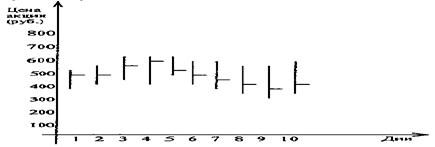 1) Столбиковая диаграмма (бары). Каждый столбик на диаграмме показывает разброс цены акции за прошедший день. Верхняя точка столбика говорит о самом высоком значении цены, нижняя — о самом низком ее значении за день. На уровне цены закрытия к столбику проводится перпендикулярная черточка.