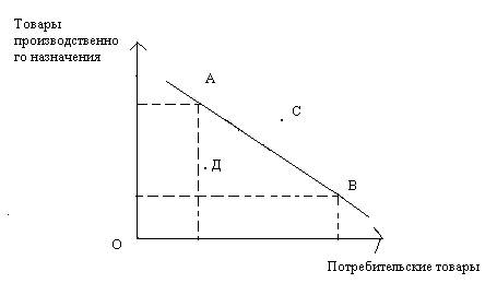 Комбинация благ А и В вне линии производственных возможностей (точка С) невозможна при данном состоянии производственных факторов. Производственные возможности возрастут лишь в том случае, если будет использовано больше ресурсов. Линия производственных возможностей передвинется вверх вправо. Комбинация внутри линии производственных возможностей (точка Д)возможна, однако при этом часть производственных факторов не будет использована. Линия производственных возможностей сместится влево вниз.