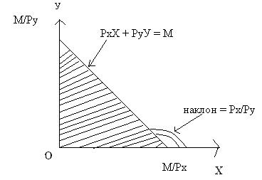 Как отмечалось выше, возможности потребительского выбора определяются бюджетными ограничениями и ценами товаров. Для потребителей, имеющих ограниченный доход, проблема заключается в том, каким образом его потратить, чтобы получить максимум удовлетворения. В условиях бюджетного ограничения общая сумма расходов должна будет равняться денежному доходу, не превышать его (М). Бюджетное ограничение, представленное в виде уравнения прямой РхХ+РуУ=М, называют бюджетной линией. Она представляет собой совокупность всех комбинацией или набора товаров, которые покупатель может приобрести при данном уровне дохода и ценах на товары.