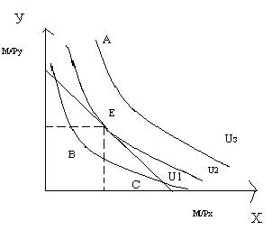 2) предельная норма замещения была равна соотношению цен товаров Х и У, т.е. МRSxy=Px/Py.