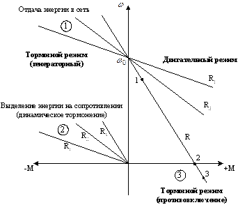Во время остановки или перемены направления движения электродвигатель работает в тормозном режиме на одной из характеристик, соответствующих осуществляемому способу торможения.