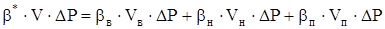 где V - объем фиктивной среды, равный сумме объемов воды, нефти и твердого скелета пласта; Vп, Vв, Vн - общие объемы твердого скелета пласта и насыщающих его воды и нефти соответственно; β* - приведенный коэффициент упругости пласта.