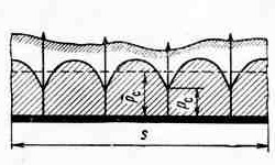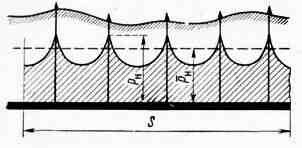 В технологии добычи нефти часто пользуются такими понятиями, как «давление на линии нагнетания» и «давление на линии отбора». Введение этих понятий упрощает физическую картину фильтрации жидкости от линии расположения нагнетательных скважин к рядам добывающих скважин, а также позволяет однозначно характеризовать депрессию обусловливающую приток жидкости к линиям отбора. Давление на линии нагнетания - это среднеинтегральное давление в пласте вдоль линии нагнетательных скважин. Вокруг нагнетательных скважин образуются репрессионные воронки, обращенные вверх с наибольшим давлением (вершина воронки) на забоях нагнетательных скважин (рис. 3.2). На рисунке ординаты заштрихованной части эпюры - абсолютные величины давлений в пласте, изменяющиеся вдоль S. Средняя ордината, т. е. высота рн прямоугольника длиной S и площадью РнS, - среднеинтегральное давление.