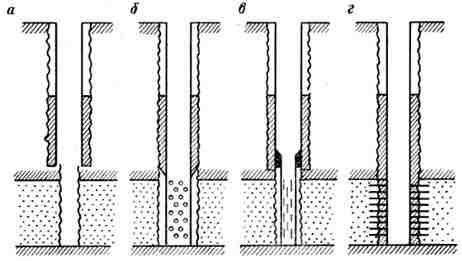 перед ее спуском; в - забой с фильтром; г - перфорированный забой