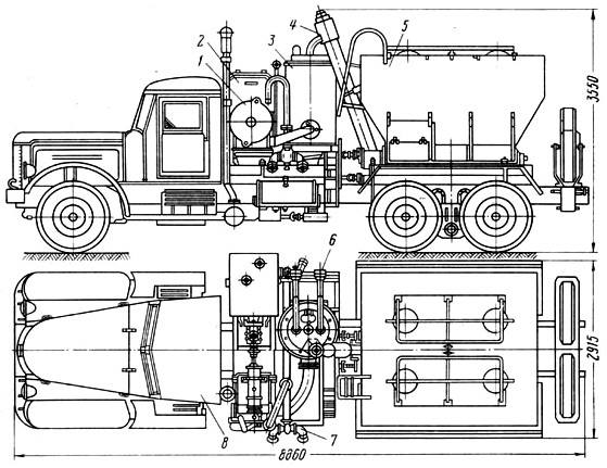 1 - автомобиль КрАЗ-257; 2 - кабина управления; 3 - силовой агрегат; 4 - коробка скоростей; 5 - муфта сцепления; 6 - насосный агрегат; 7 - выкидной маинфольд; 8 - соединительные трубы высокого давления.