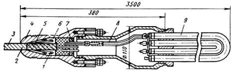 1 - крепление кабеля; 2 - проволочный бандаж; 3 - кабель-трос; 4 - головка нагревателя; 5 - асбестовая оплетка; 6 - свинцовая заливка; 7 - нажимная гайка; 8 - клеммная полость; 9 - нагревательпые трубки.