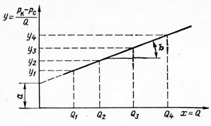Имея фактические точки, т. е. Qi, и Pci, и строя по ним график в координатах у = (Pк - Рc) / Q и x = Q, получаем прямую, не проходящую через начало координат и отсекающую на оси у отрезок a, b - угловой коэффициент этой линии (рис. 6.3):
