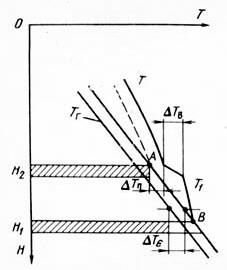 При закачке горячей воды (точка А2) сначала будет происходить передача теплоты от воды к окружающим горным породам. На некоторой глубине термограмма потока Тп пересечет геотерму Тг в точке М, называемой точкой инверсии. Ниже точки М будет происходить нагрев воды. Стабилизация теплообмена наступит на некоторой глубине в точке В2 ниже которой Тп будет параллельна геотерме Тг. Из этого следует, что возможен случай, когда геотерма и термограмма будут параллельны, начиная с самого устья (точка А3).