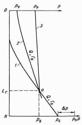 Зная закон изменения давления газового столба и пренебрегая потерями на трение при движении газа по межтрубному пространству (рис. 9. 15, кривая 3), которые малы, можно определить рабочее давление нагнетаемого газа на устье Рp. Например, при использовании упрощенной формулы (9.53), решая ее относительно давления на устье, получим
