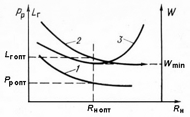 По этим данным можно построить различные графические зависимости, которые позволят выбрать режим работы газлифта, отвечающий техническим возможностям промысла. Если учитывать главные режимные параметры - расход газа и его давление, то достаточно построить график Рp = f(Rн) (рис. 9.17). Через нанесенные на график четыре точки проводим плавную кривую 1, которая позволит выбрать любой промежуточный режим, лежащий между расчетными точками. График должен быть дополнен кривой зависимости Lp = f(Rн) (рис. 9.17, кривая 2). Если при выборе режима работы газлифта должны быть приняты во внимание энергетические условия, то на тот же график необходимо нанести кривую W = f(Rн). Этот график может иметь минимум (рис. 9.17, кривая 3). Построение таких графиков позволяет выбрать любой промежуточный режим, отличающийся от расчетных, и установить параметры оптимального режима работы газлифта, отвечающего минимальной удельной энергии. Как видно из рис. 9.17, минимуму W соответствуют оптимальные рабочее давление Рроп, расход газа Rноп и глубина спуска башмака или установки рабочего клапана Lгoп.
