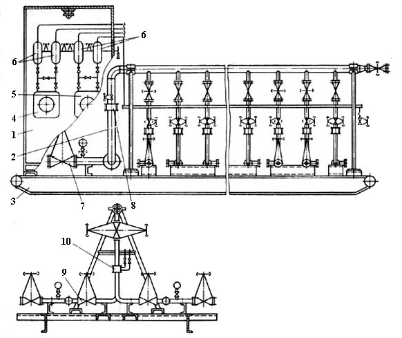 1 - шкаф КИП; 2 - трубопроводная обвязка; 3 - рама; 4, 5 - дифманометры; 6 - разделительный сосуд; 7 - запорная арматура; 8,10 -диафрагма; 9 - регулирующая арматура